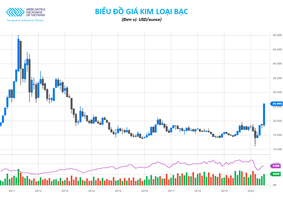 Giá Bạc đạt đỉnh mọi thời đại ở thời điểm năm 2011 với mức 49.80 USD/ounce, trước khi chạm đáy ở mức 11.64 USD/ounce ở khoảng giữa tháng 3 năm nay. Trái với Vàng khi kim loại này liên tục xác lập những đỉnh mới trong những ngày gần đây, Bạc hiện cách đỉnh giá khoảng 25 USD, yếu tố có thể thúc đẩy đà tăng của giá trong thời gian tới.