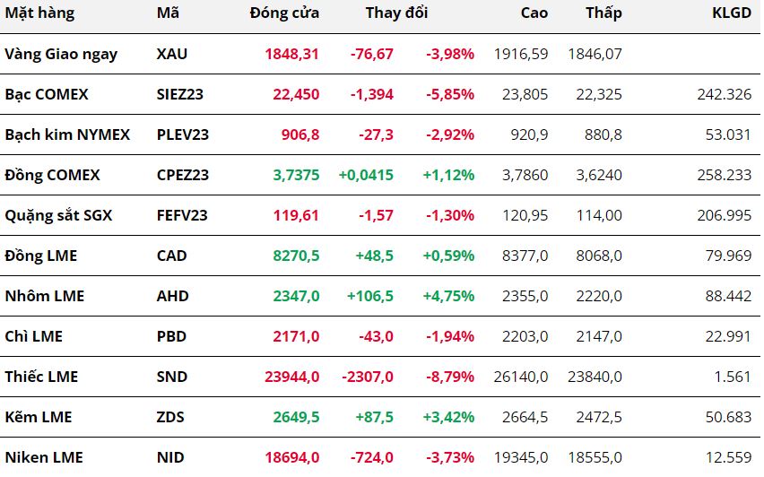 Khép lại phiên giao dịch cuối cùng của tháng 9, sắc xanh đỏ đan xen trên bảng giá thị trường kim loại. Đối với nhóm kim loại quý, giá cả ba mặt hàng đều giảm, chấm dứt hai tuần tăng liên tiếp. Cụ thể, giá vàng đánh mất mốc 1.900 USD/ounce khi giảm 3,98% xuống 1.848,31 USD/ounce. Giá bạc giảm 5,85%, đóng cửa tuần tại mức 22,45 USD/ounce, đây cũng là tuần ghi nhận mức giảm mạnh nhất của giá bạc kể từ tháng 6/2023. Giá bạch kim cũng giảm về 906,8 USD/ounce sau khi giảm 2,92%.
