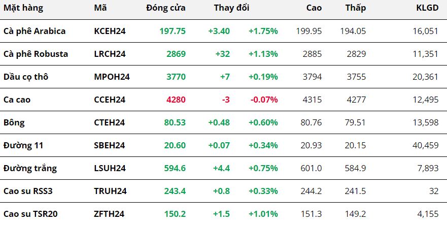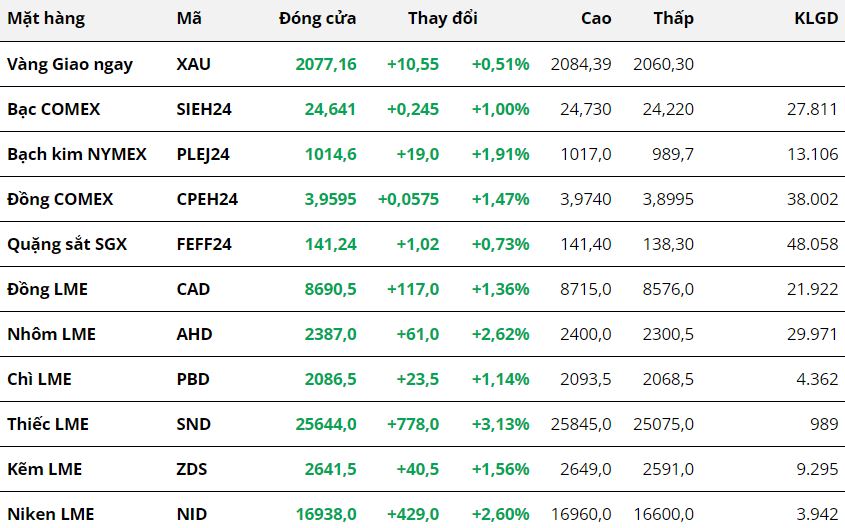 Đối với nhóm kim loại cơ bản, lực mua cũng được củng cố bởi đà suy yếu của đồng USD. Giá đồng COMEX tăng 1,47%, hiện đang đạt mức cao nhất trong vòng 5 tháng qua. Các kim loại giao dịch liên thông với Sở LME cũng đồng loạt tăng giá.