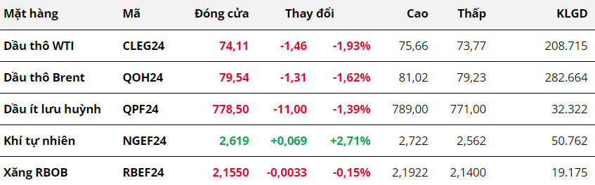 Cụ thể, giá dầu WTI giảm 1,93% xuống 74,11 USD/thùng. Dầu Brent đóng cửa tại 79,54 USD/thùng, giảm 1,62% so với phiên trước.