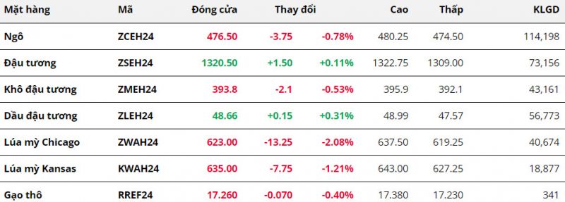 Ngô ghi nhận mức giảm nhẹ gần 1%, chấm dứt chuỗi ba phiên liên tiếp tăng giá. Theo Reuters, Trung Quốc đã cấp giấy phép cho 26 công ty nội địa để sản xuất và phân phối hạt giống ngô biến đổi gen (GMO). Việc trồng thương mại các giống GMO sẽ làm tăng năng suất cây trồng và giảm đáng kể lượng nhập khẩu ngô từ Mỹ và Brazil của Trung Quốc trong tương lai. Lo ngại về nhu cầu từ Trung Quốc là yếu tố đã tạo sức ép lên giá mặt hàng này.
