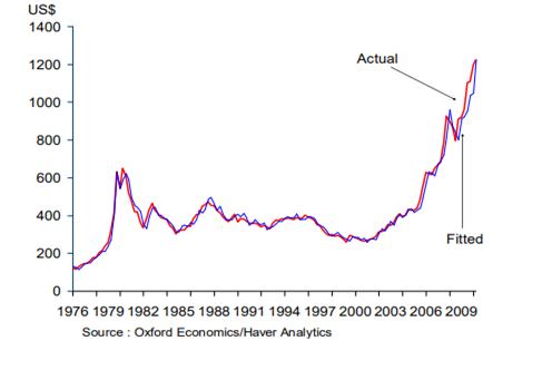 Kết hợp các yếu tố dài hạn và ngắn hạn này, chúng tôi ước tính một phương trình giải thích các biến động trong giá danh nghĩa của vàng trong giai đoạn 1976-2010. Phương trình được ước tính sử dụng dữ liệu hàng quý.
