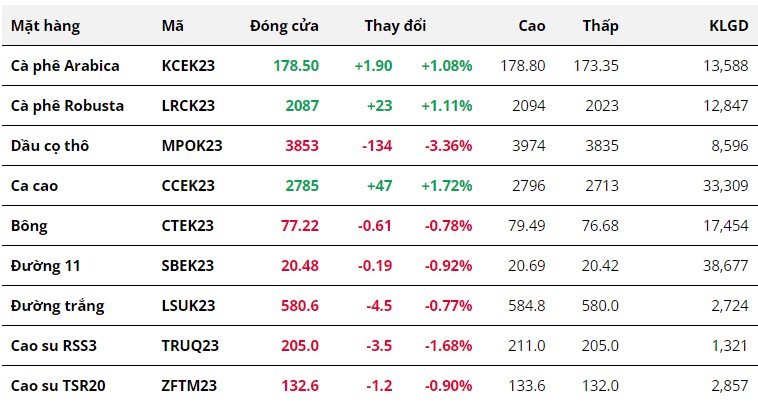 Ca cao ghi nhận phiên tăng thứ 3 liên tiếp với mức tăng 1,72% trong phiên hôm qua. Lo ngại về thiếu hụt nguồn cung do lượng ca cao cập cảng tại Bờ Biển Ngà tính từ đầu niên vụ đến nay chỉ ở mức 1,7 triệu tấn, giảm 5,4% so với niên vụ trước tiếp tục hỗ trợ giá tăng.